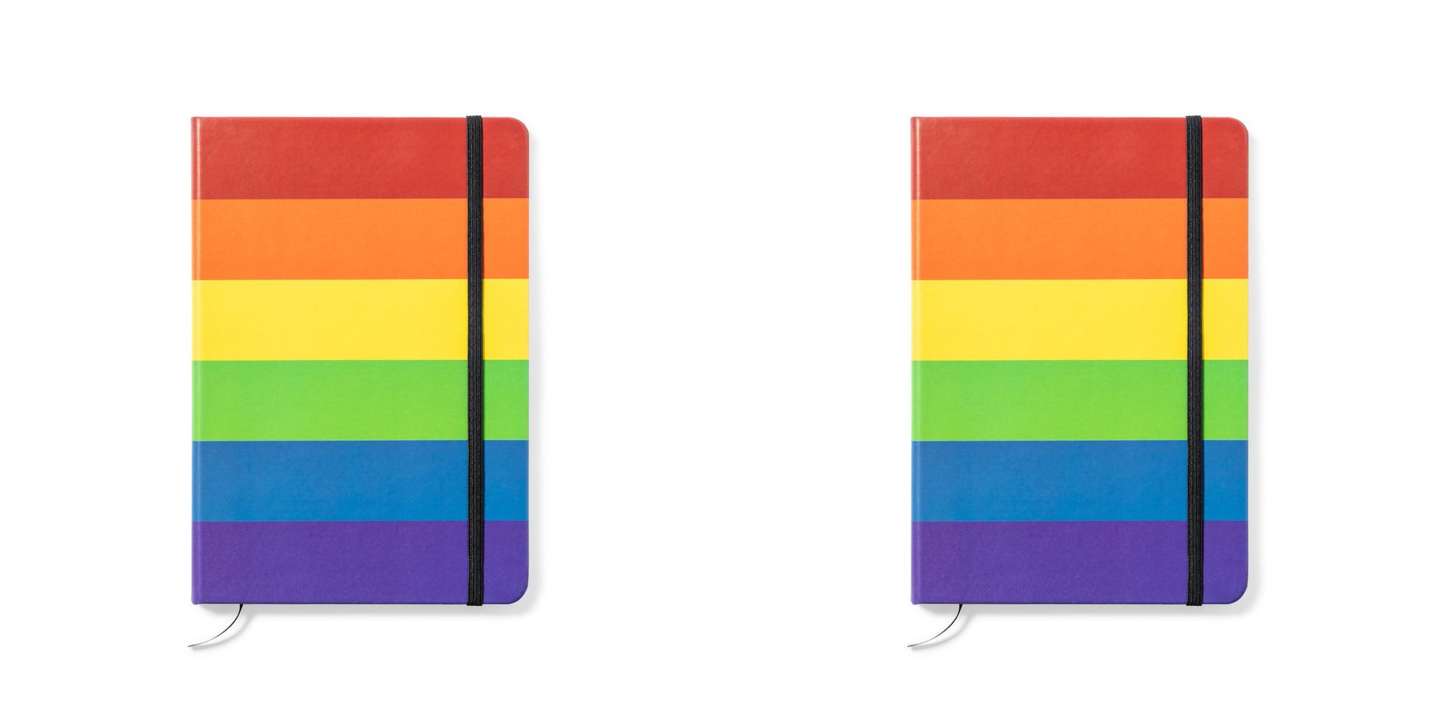 Bloco de notas Rainbow multicolor, com capas duras em polipele de toque macio e elástico de fixação.