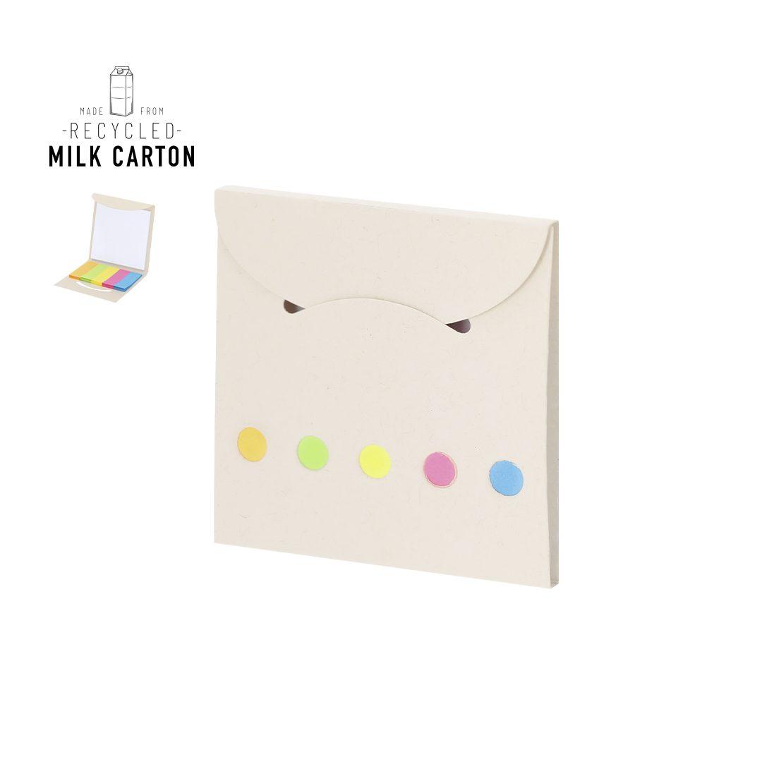 Bloco de notas com capas fabricadas em caixas de leite recicladas.