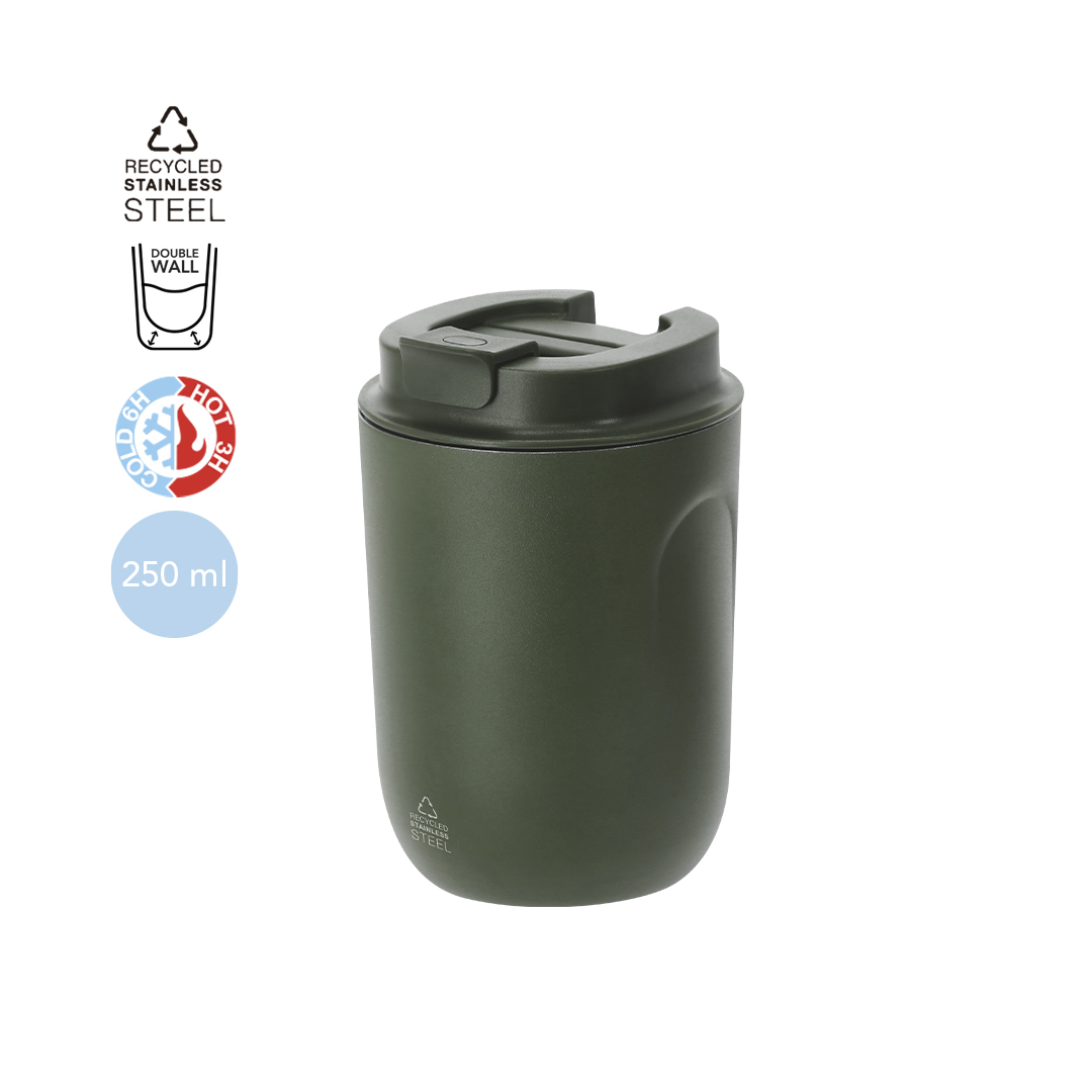 Copo térmico de dupla parede com capacidade de 250 ml, feito de Aço Inoxidável Reciclado com acabamento semi-mate.