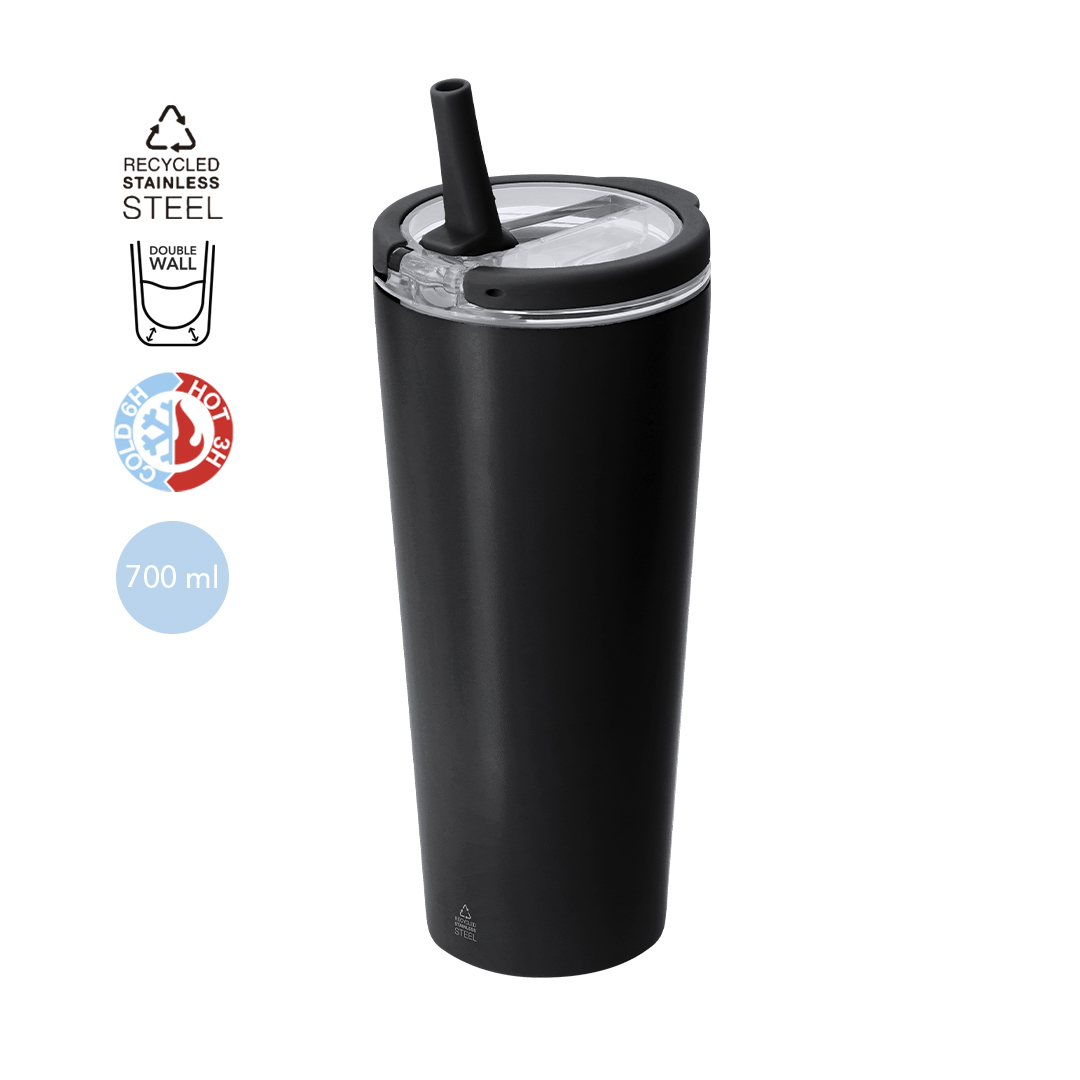 Elegante copo térmico em aço inoxidável reciclado de dupla parede com capacidade de 700 ml.