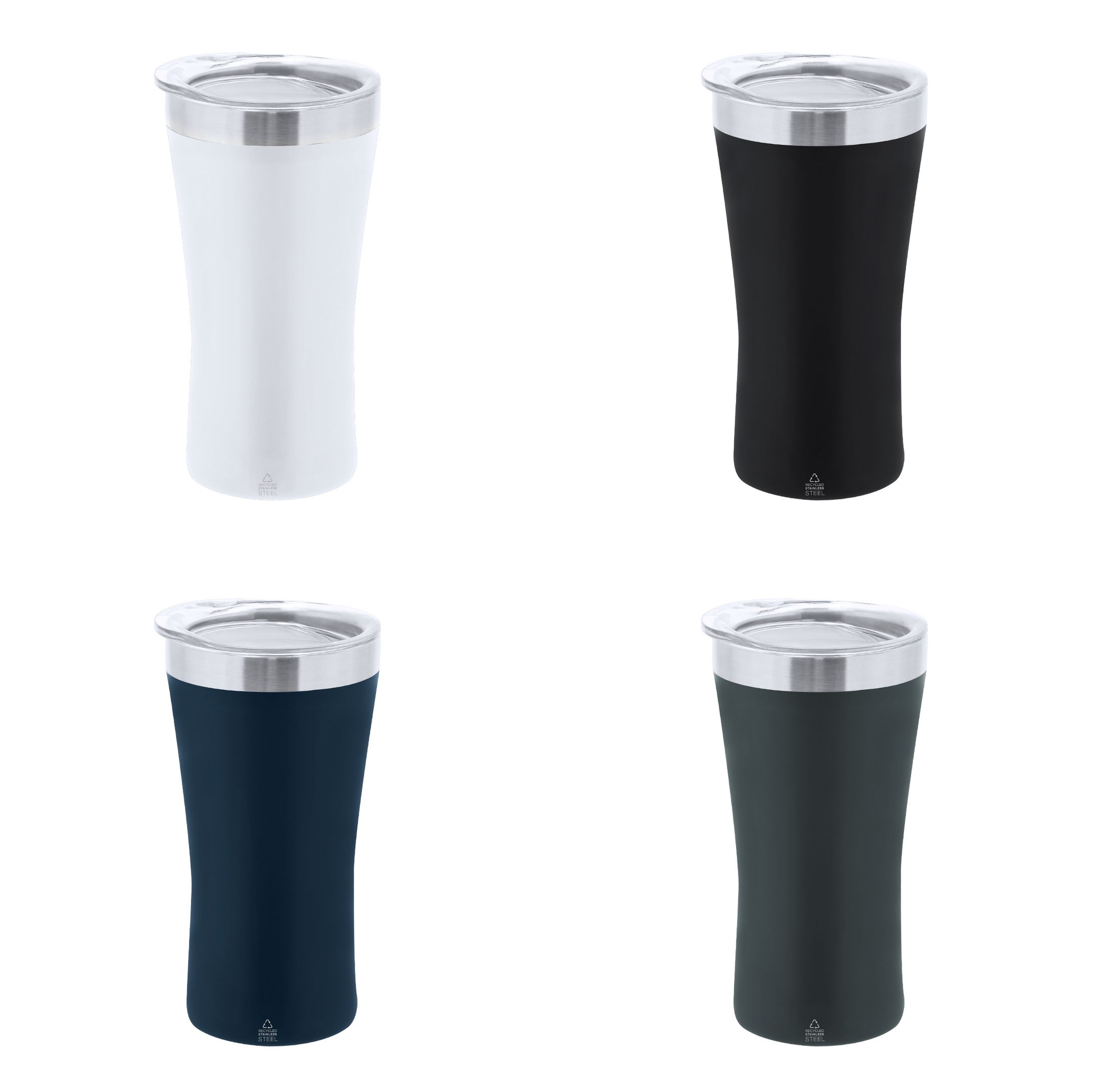 Copos térmicos fabricados em Aço Inox Reciclado de dupla parede e 150 ml de capacidade. Exterior com acabamento acetinado e interior com acabamento em aço. Inclui tampa com fechamento por pressão transparente, com dosificador e livre de BPA. É ideal para ter em sua mesa, mesa ou em qualquer superfície onde possa desfrutar tranquilamente da sua bebida favorita. Com logotipo de Aço Inox Reciclado.