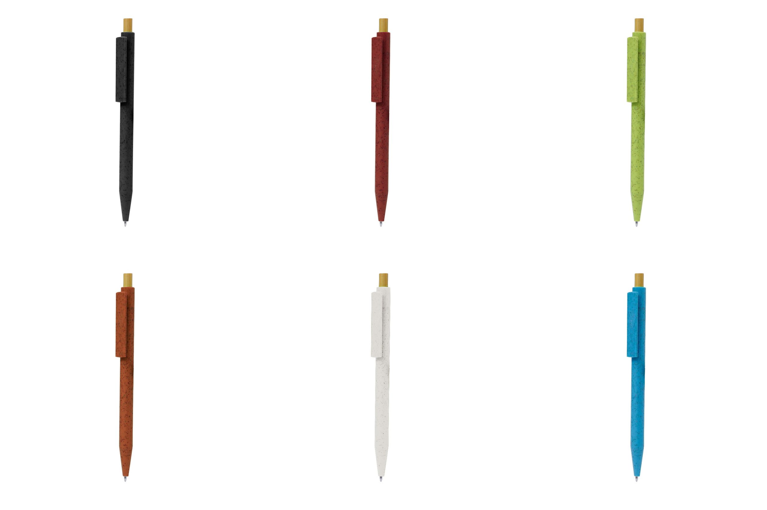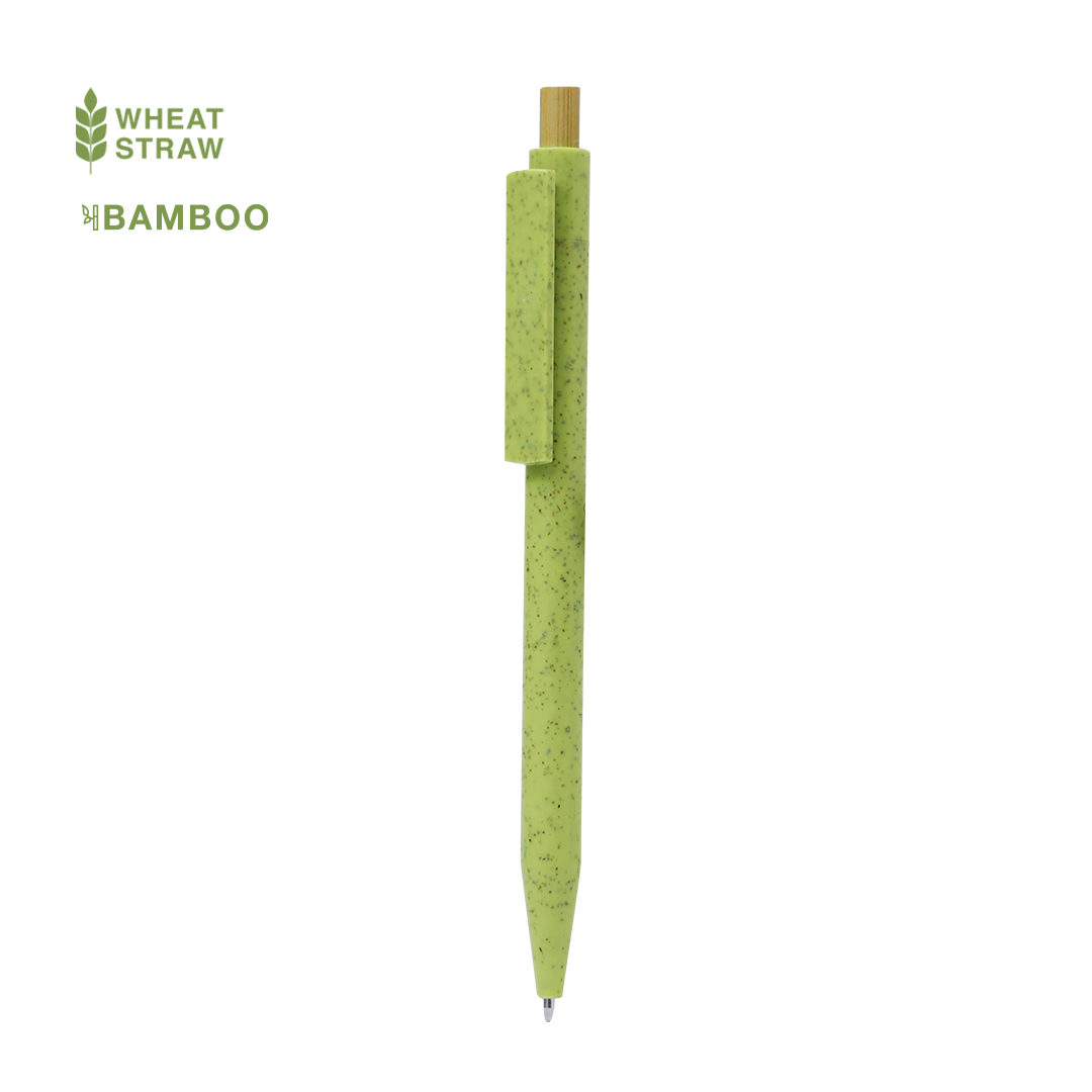 Com corpo e clip combinando, de mecanismo de pressão fabricado em bambú e tinta azul.