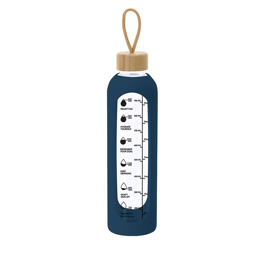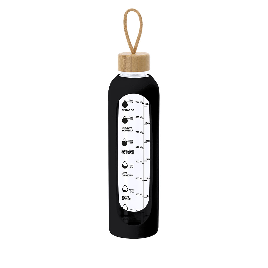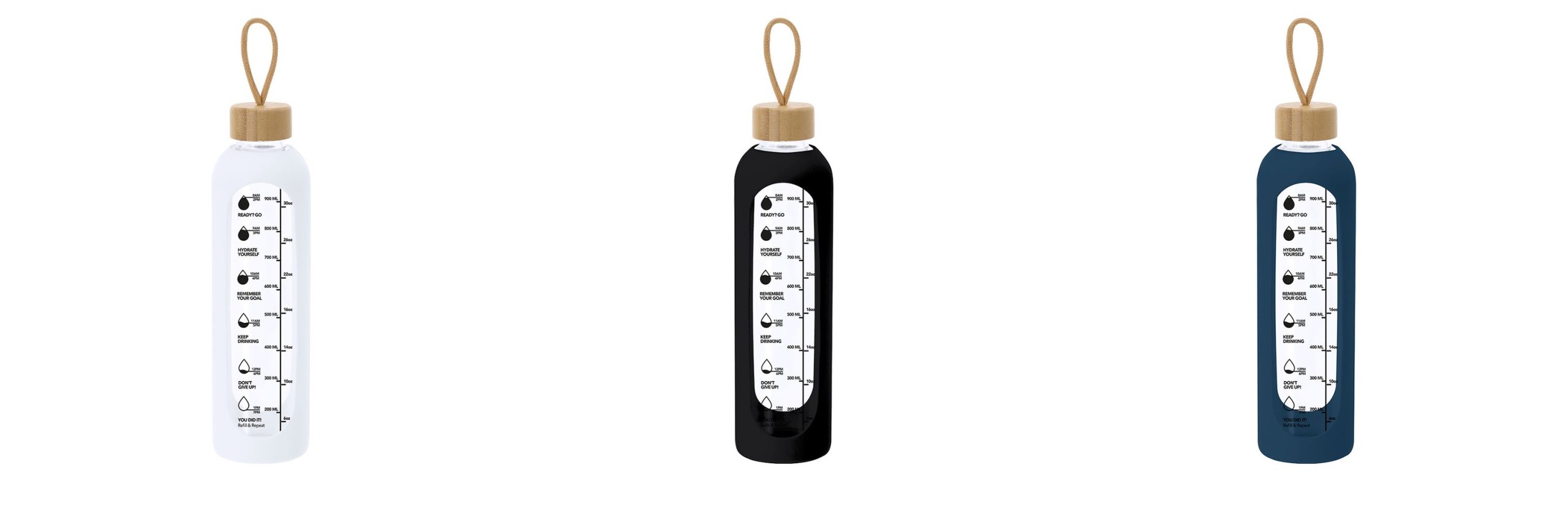 Garrafa fabricada em vidro de 1L de capacidade, projetada para fomentar uma hidratação adequada.