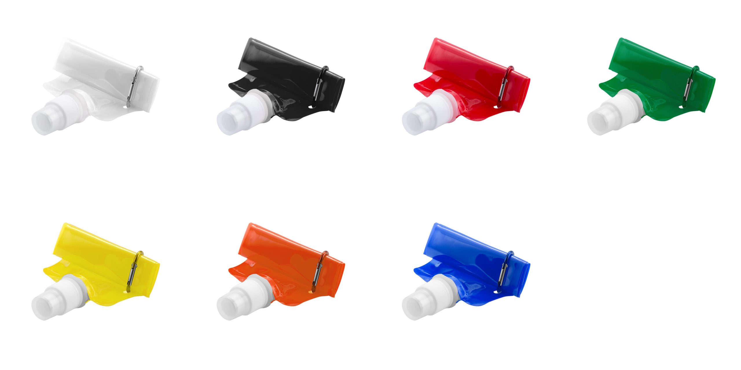 Garrafa com 400 ml de capacidade com corpo flexível em material PET de cores vivas.