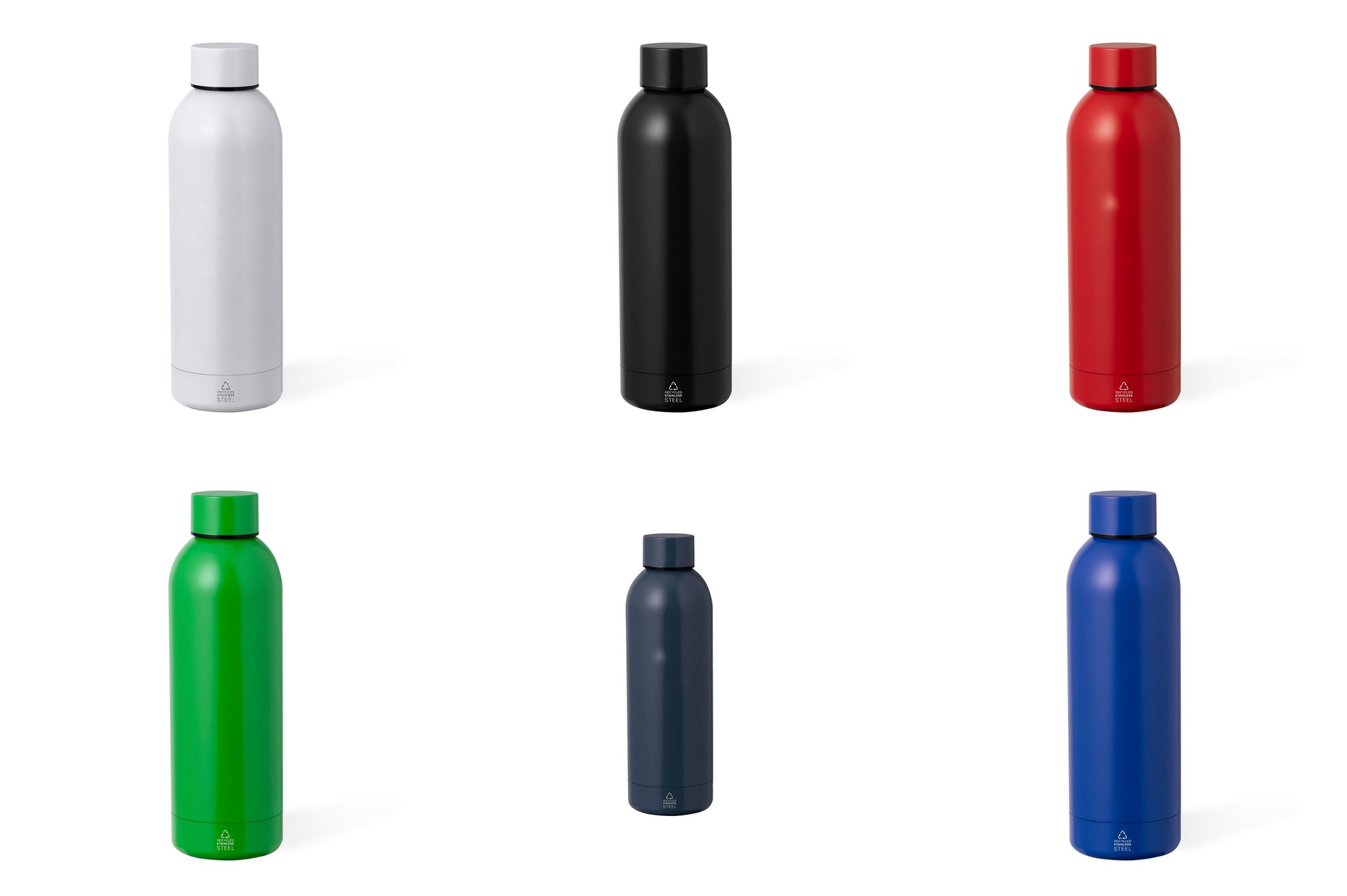 Garrafa térmica de 500 ml de capacidade, fabricada em Aço Inox Reciclado de dupla parede.
