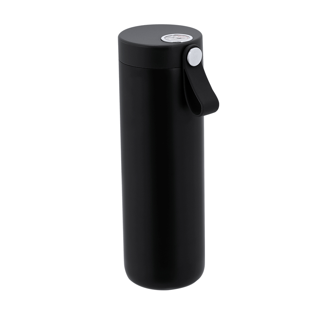 Garrafa térmica de aço inox e dupla parede de 500 ml de capacidade, com medidor de temperatura analógica, com faixa de 0º a 100º. Com tampa de segurança, alça de silicone integrada e corpo à combinação. Livre de BPA.
