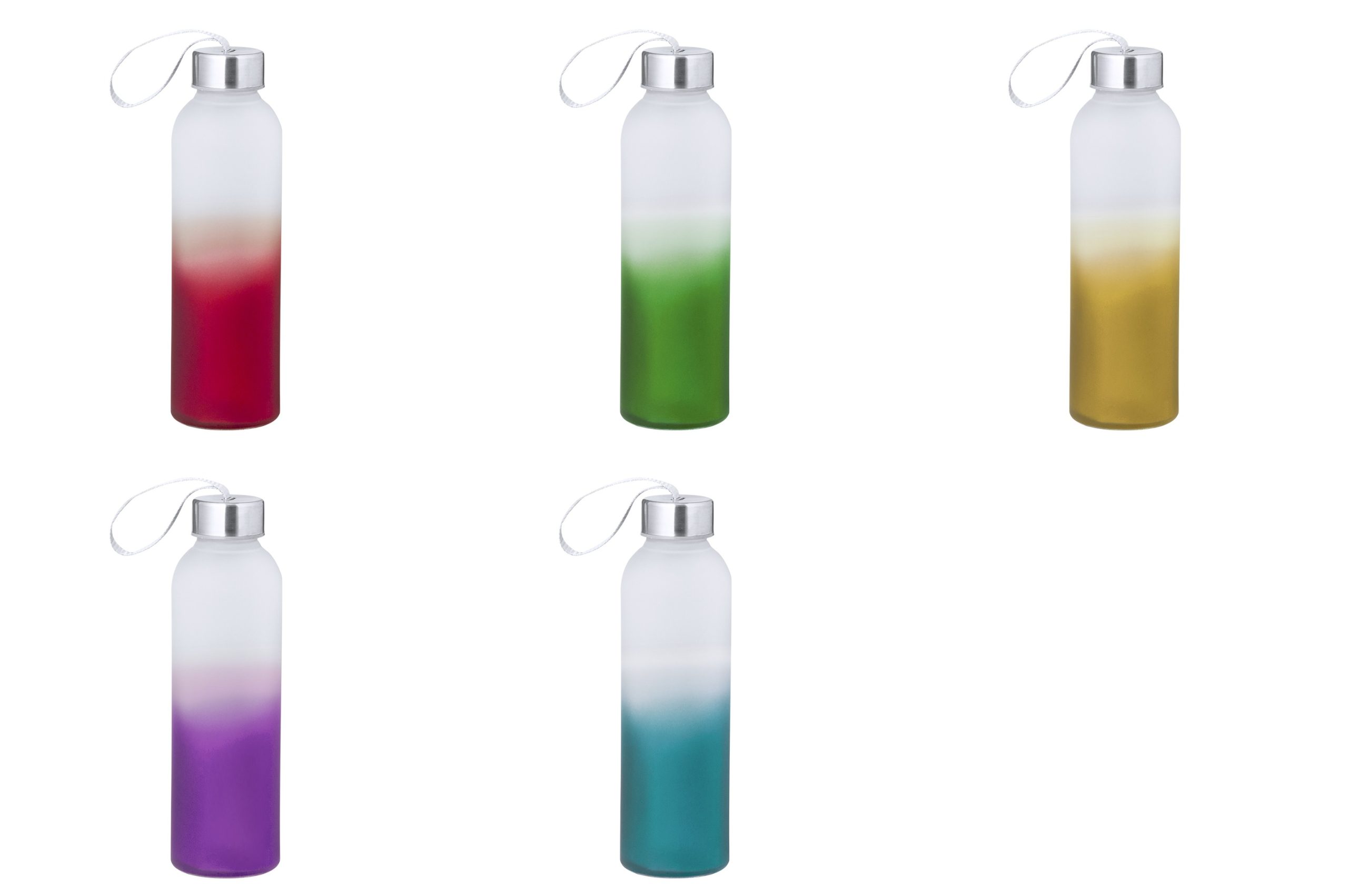 Garrafa de vidro e aço inoxidável com 500 ml de capacidade.