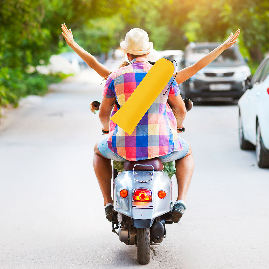 É apresentado em uma prática capa transparente combinando com o guarda-sol, com fechamento de cordão e fita para transporte.