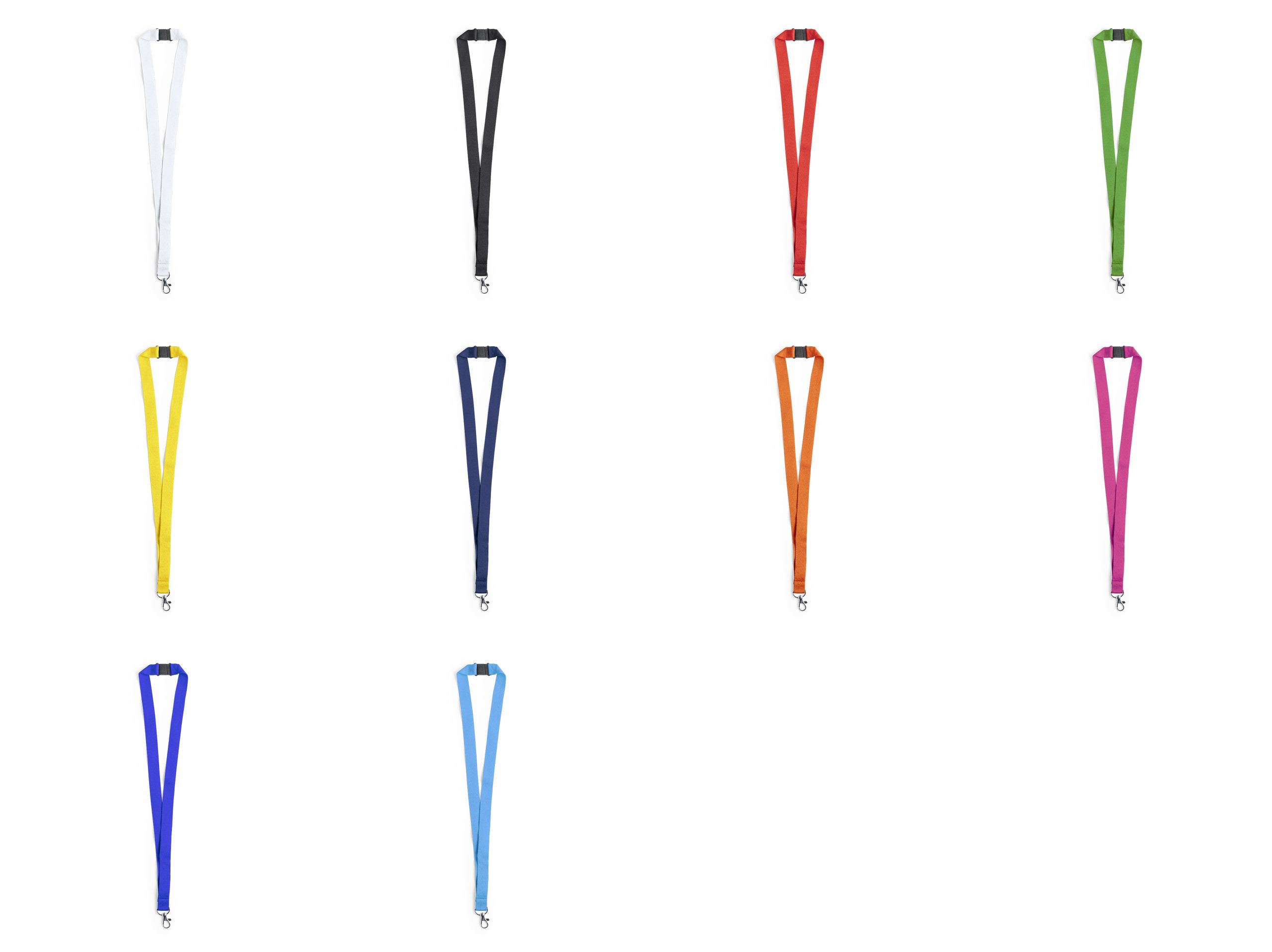 Lanyard em poliéster resistente, com fecho de segurança no pescoço e mosquetão de metal.