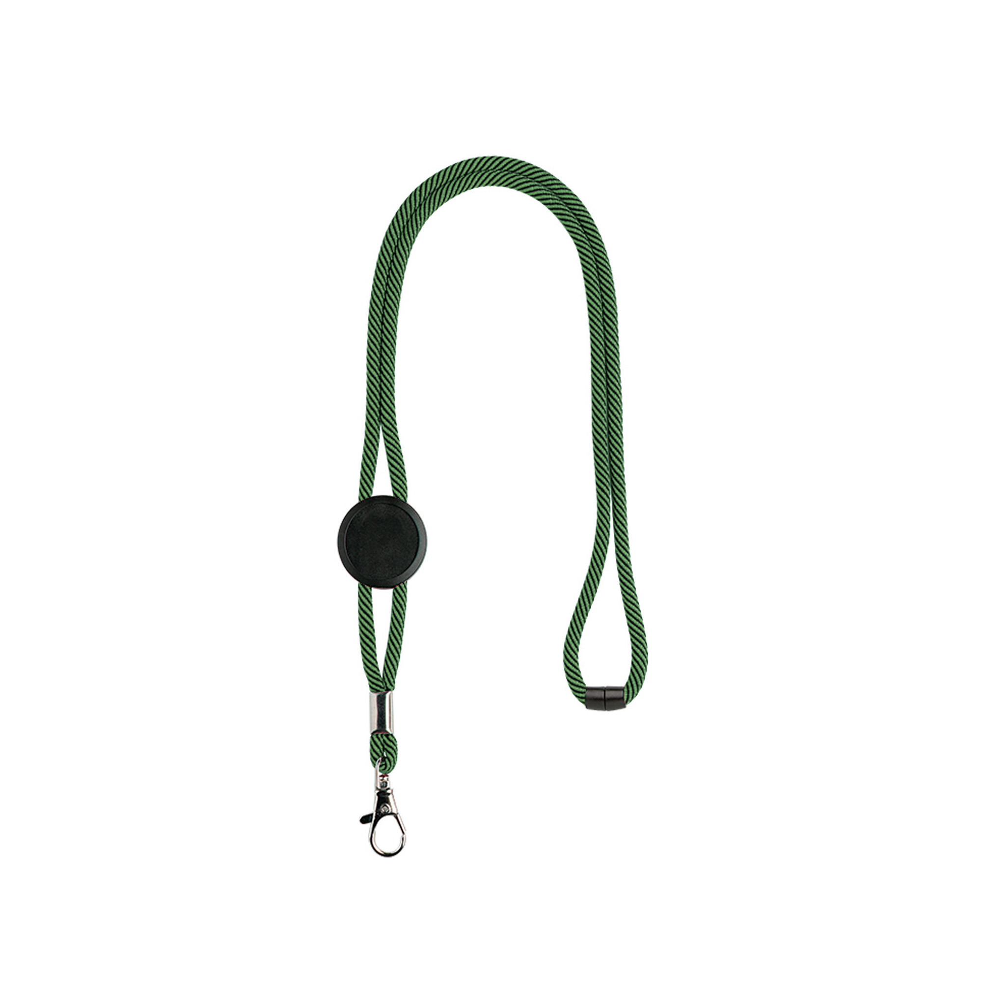 Lanyard tubular em poliéster, ajustável, fecho de segurança e mosquetão.