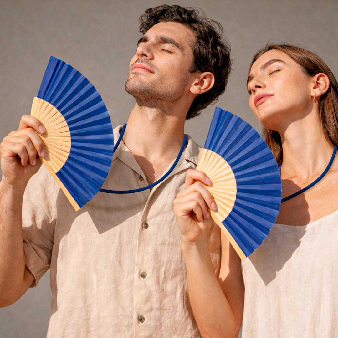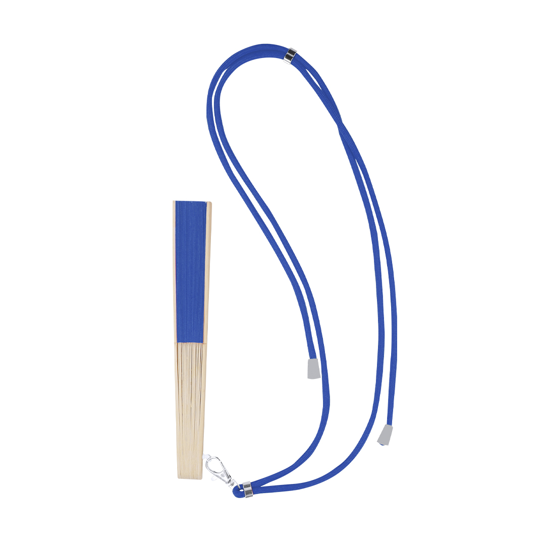 Leque feito com tecido de poliéster resistente e varas flexíveis de bambú.