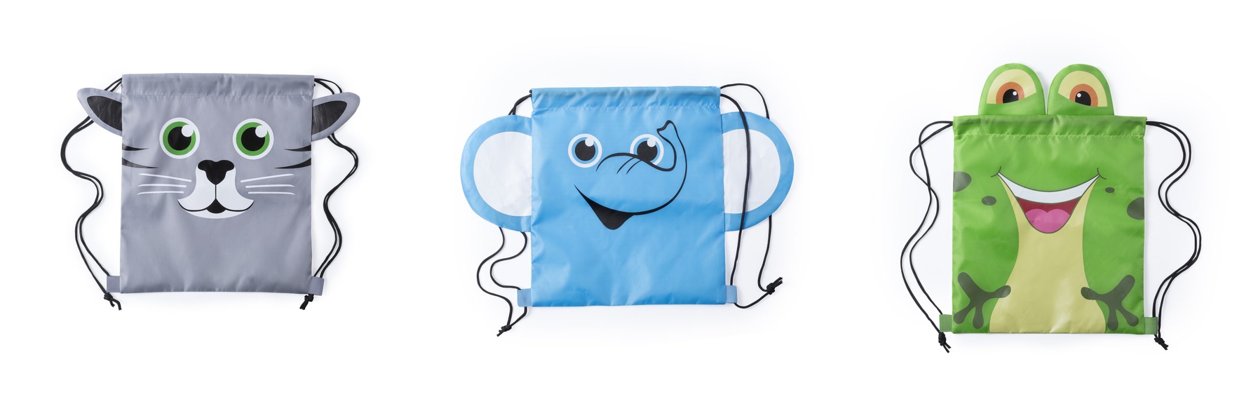 Mochila de cordão para crianças, em poliéster 210T com desenhos originais de animais.