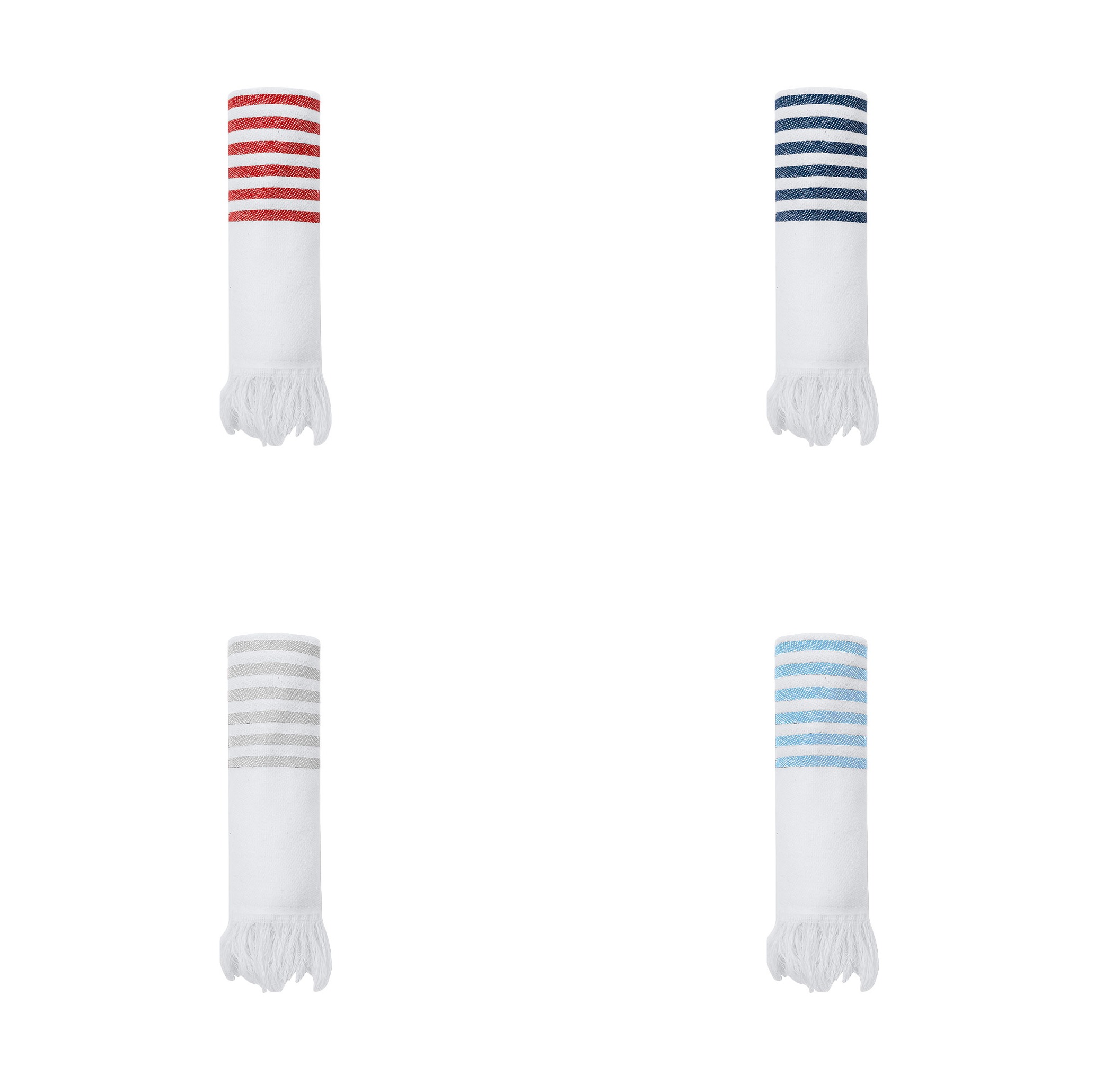 Seu design apresenta uma base em branco combinada com listras coloridas e decorada com distinguidos fios nas extremidades.