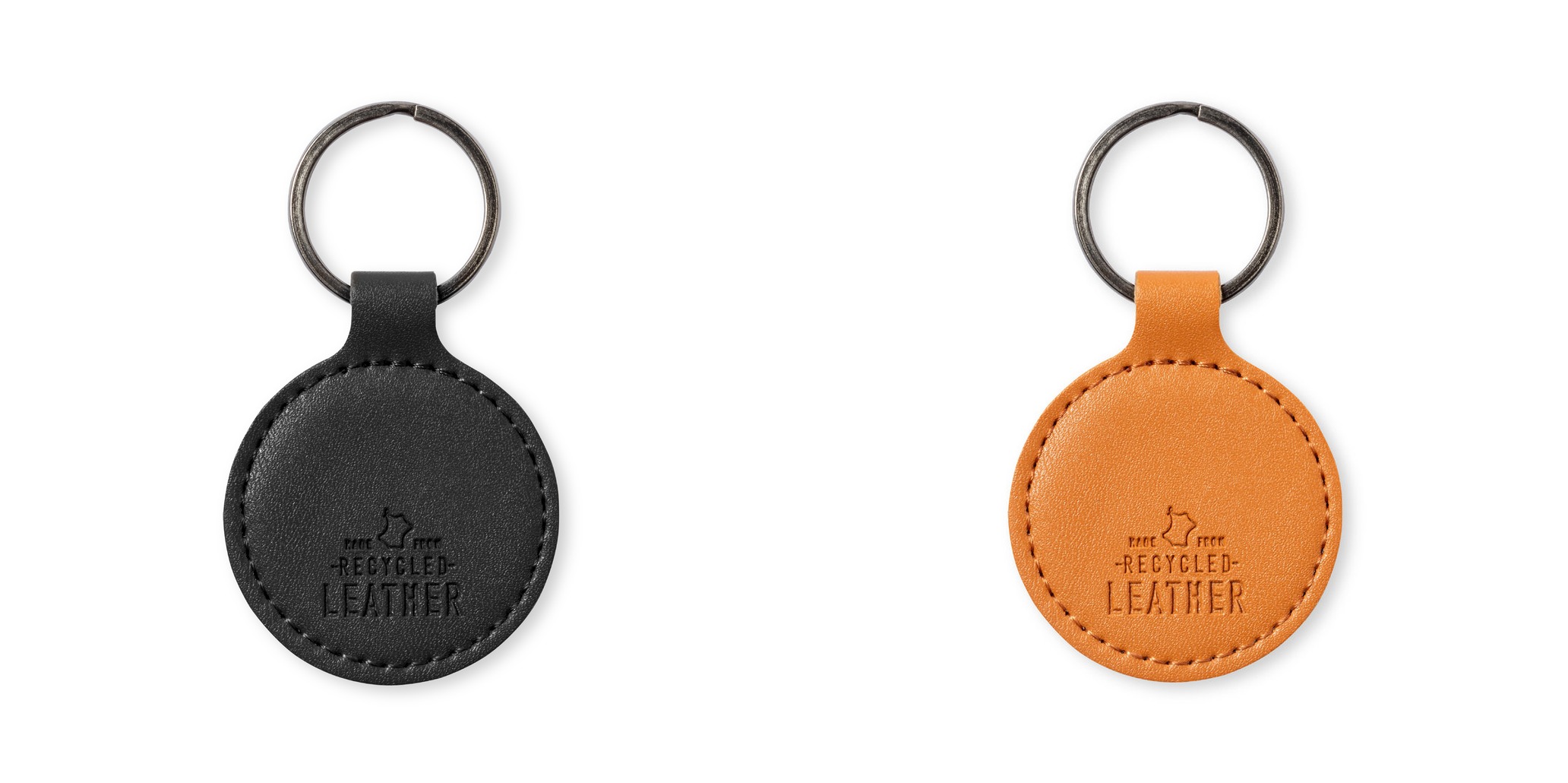 Porta-chaves de linha nature fabricado em couro reciclado. Em tom castanho e preto, com design redondo e de acabamento cosido. Gravado com distintivo couro reciclado numa face, com lado oposto liso para impressão. Anel metálico cromado e apresentado em bolsa individual kraft.