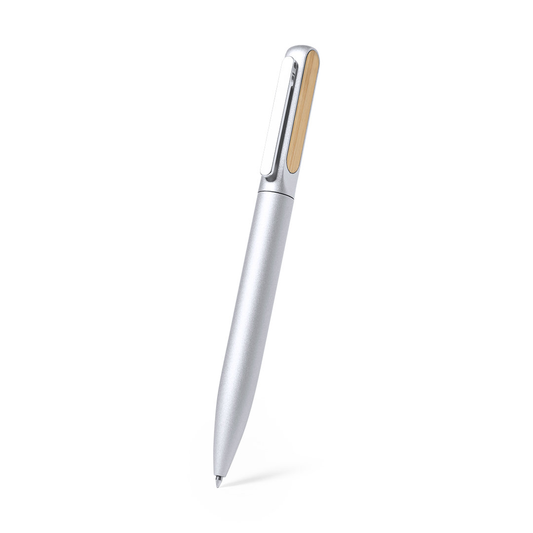 Esferográfica em alumínio de acabado mate com detalhe em bambu para impressão, de mecanismo giratório e tinta azul. Apresentada em estojo individual de acabamento mate e fecho magnético, com interior recortado para cada um dos elementos do conjunto.