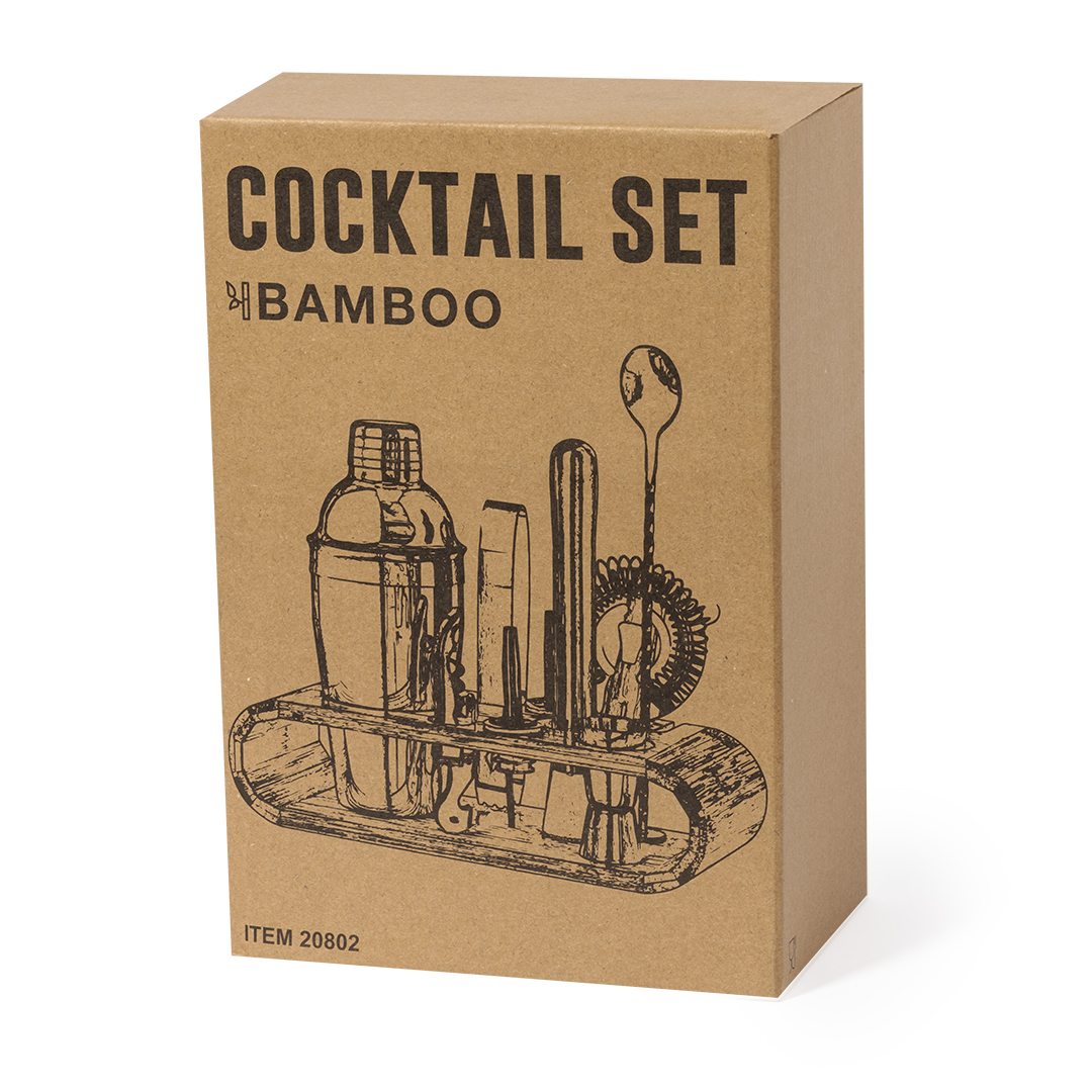 Elegante set de cocktail em aço inoxidável. Completo set que combina conceitos modernos a par dos tradicionais. Inclui todos os utensílios essenciais para configurar os melhores cocktails. Com original base de bambu para guardar e expor todos os utensílios. Apresentado numa distinguida caixa de design kraft.