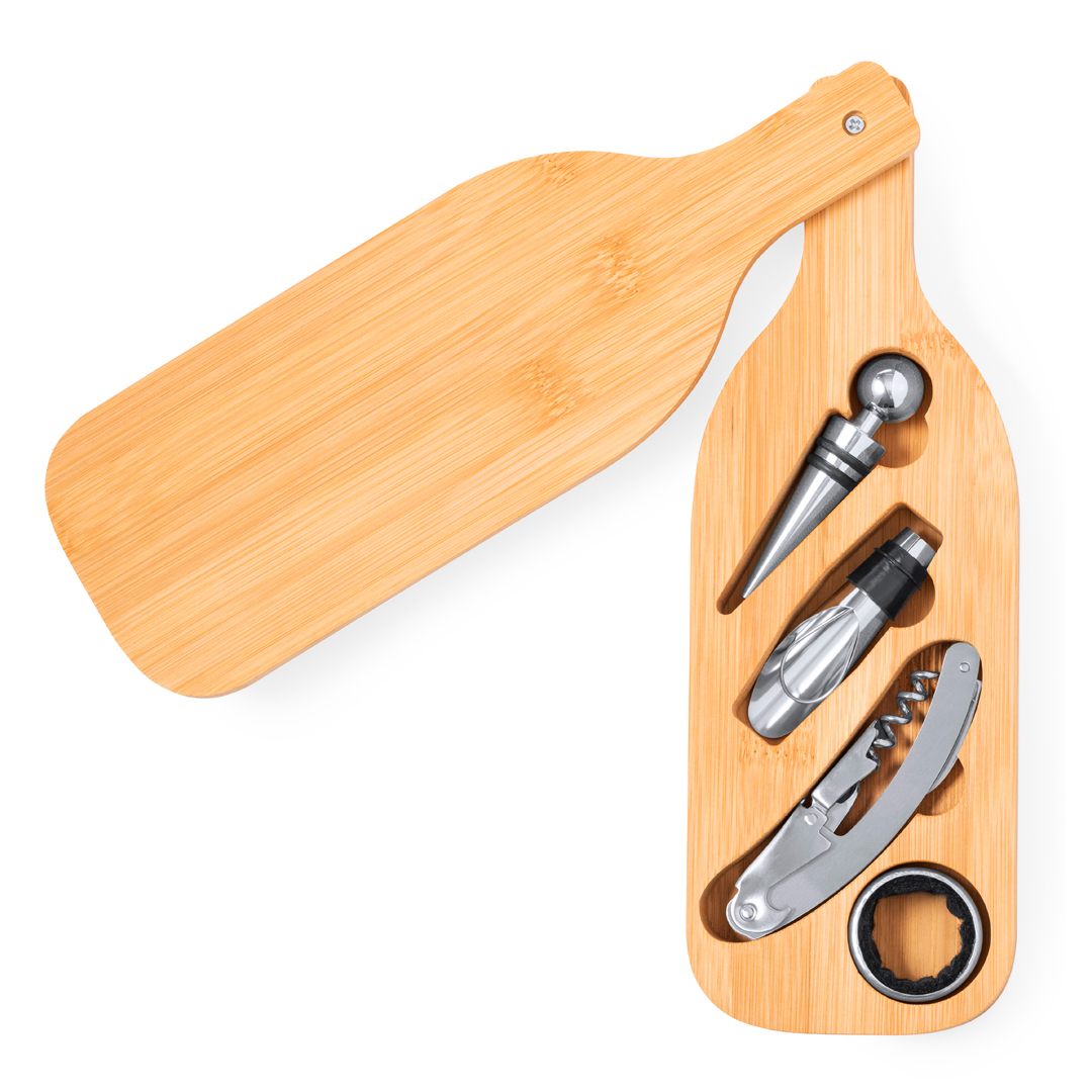Set de vinhos apresentado num design inspirado numa garrafa de vinho e talhado em bambu, com acessórios em aço inox.