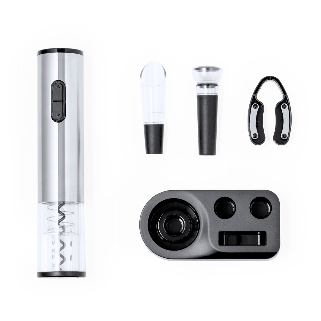Contém um saca-rolhas eléctrico alimentado por 4 pilhas AAA (não incluídas), decantador, rolha para garrafas e corta-cápsulas, com mecanismo de pressão.