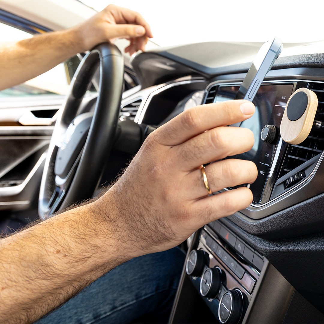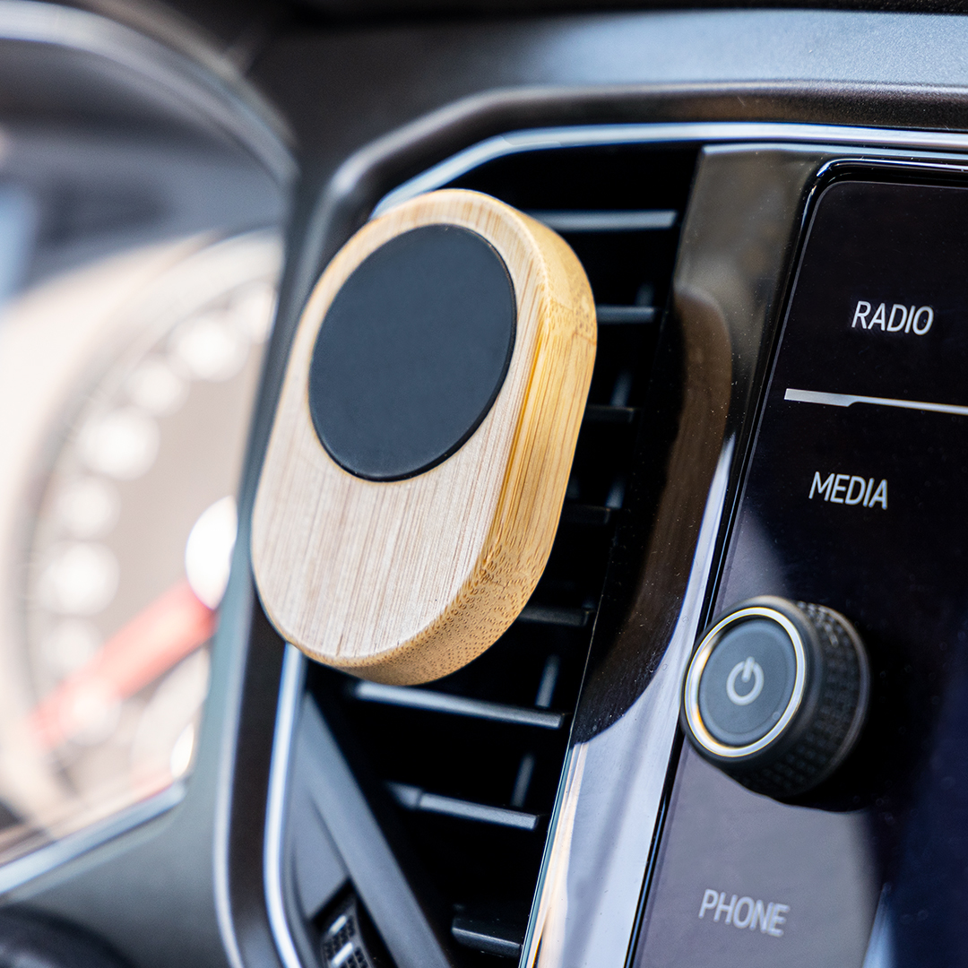 Suporte de grelha de carro para smartphone fabricado em bambu.