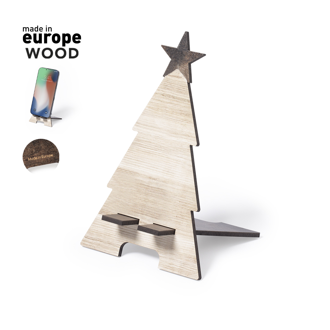 Suporte para smartphone com design de árvore de Natal, fabricado em madeira natural e de original acabamento bicolor.